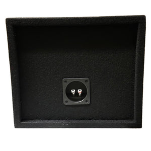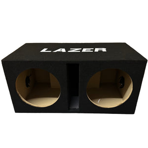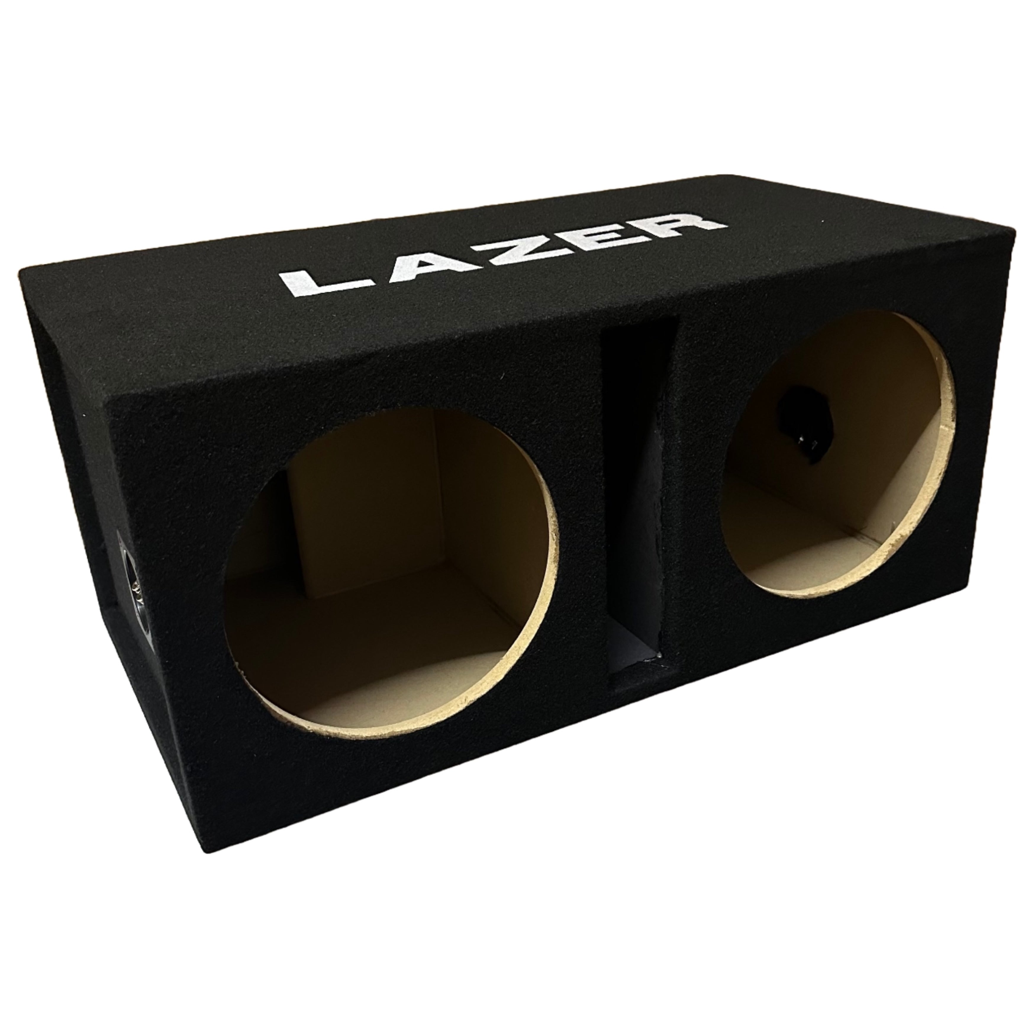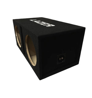 Introducing LAZER's new compact box series, designed specifically for the customer who wants to run lower-powered subwoofers. The compact box series just as its name implies, is as small as possible and still allows low tuning. Construction begins with 5/8" MDF material and is topped off with a black felt carpet and has a white stitched LAZER logo with Nickel-plated metal push terminals. Box tuning is 35Hz and recommended to run subwoofers with wattage up to 600 RMS per sub.