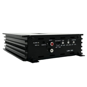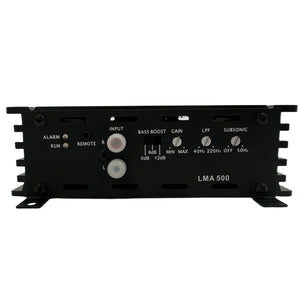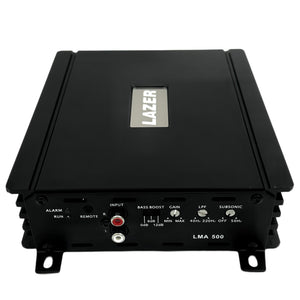 The LAZER LMA500 class D monoblock mini amplifier delivers big power in a small package. This amplifier delivers 500 RMS power into a 2 ohm load, and requires a 60A external fuse. The LMA500 was specifically designed to pair with several combinations of LAZER single 4 ohm subwoofer pairs, or dual 4 ohm single sub systems.